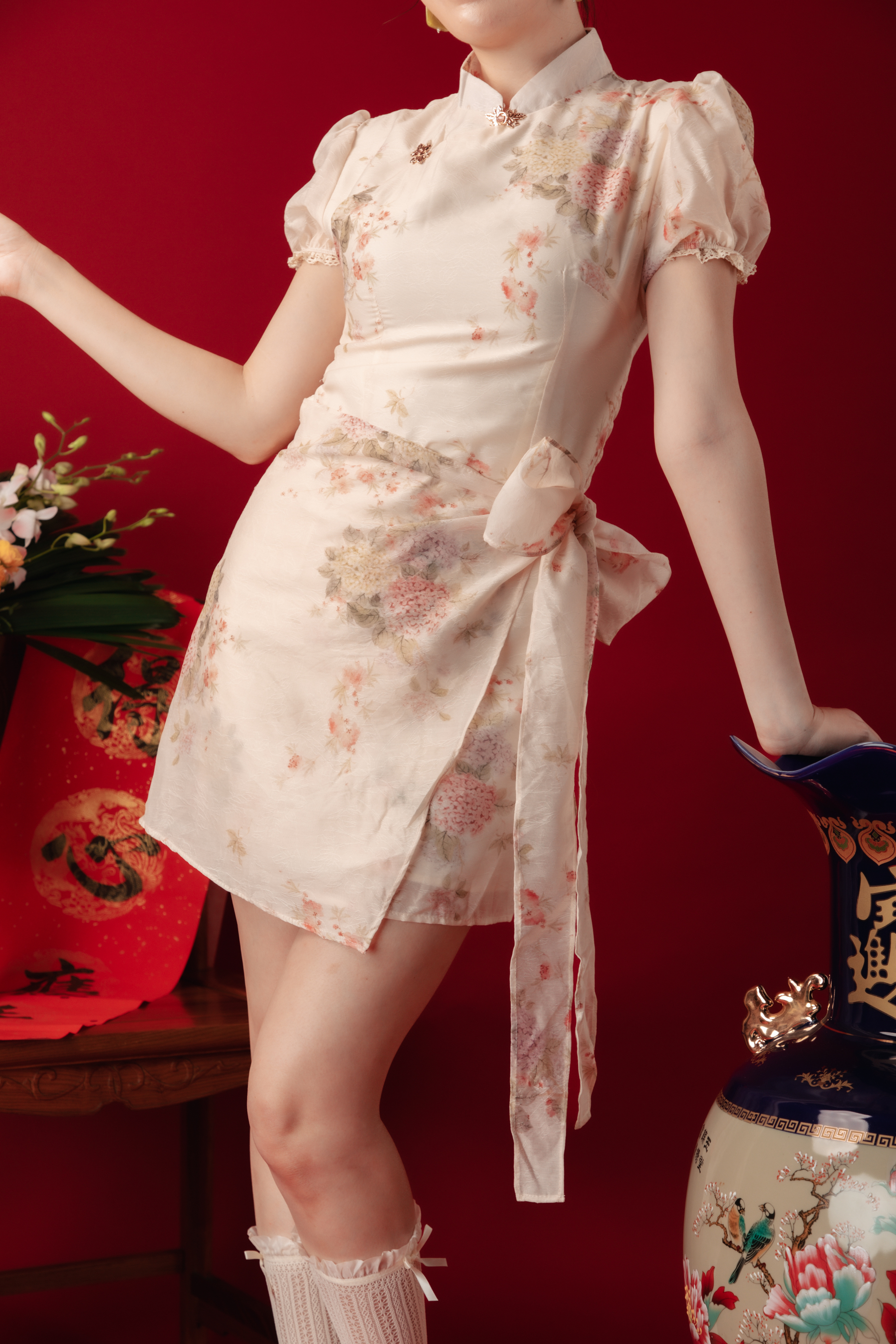 Sweet, playful, and feminine β the Amelie Blossom Wrap Cheongsam Dress features delicate floral prints on soft cream fabric, with puff sleeves and a tie-waist bow that accentuates the figure. The layered wrap skirt adds a youthful charm, blending traditional elegance with modern cuteness β perfect for CNY gatherings or date nights.