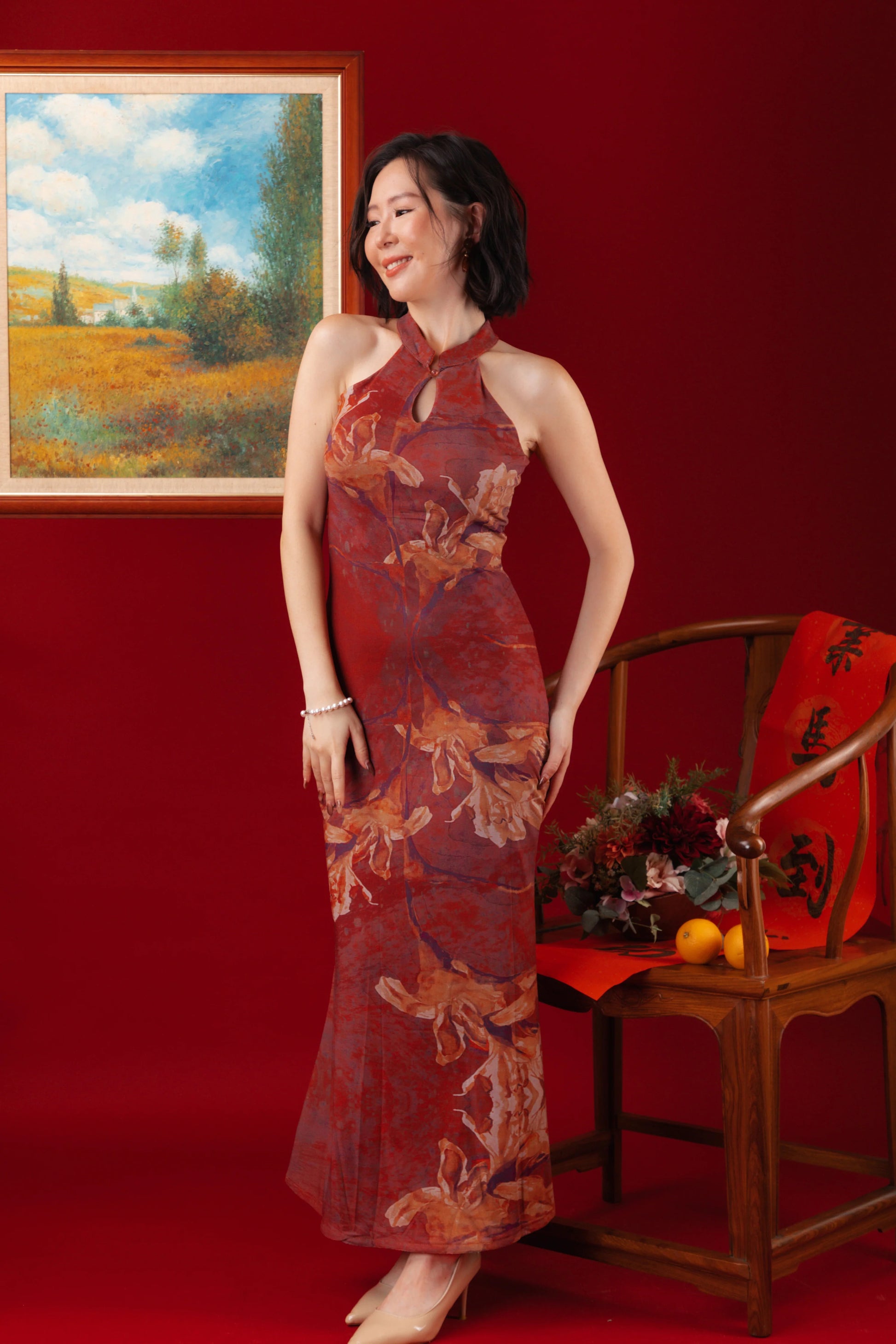 The Auburn Orchid Velvet Cheongsam Dress captures modern artistry in a vintage silhouette. Designed with a halter neckline and elegant keyhole detail, it’s crafted from soft velvet with painterly orchid motifs in earthy auburn tones. The figure-skimming cut enhances the body’s natural grace — an exquisite statement piece for evenings that call for refined allure.