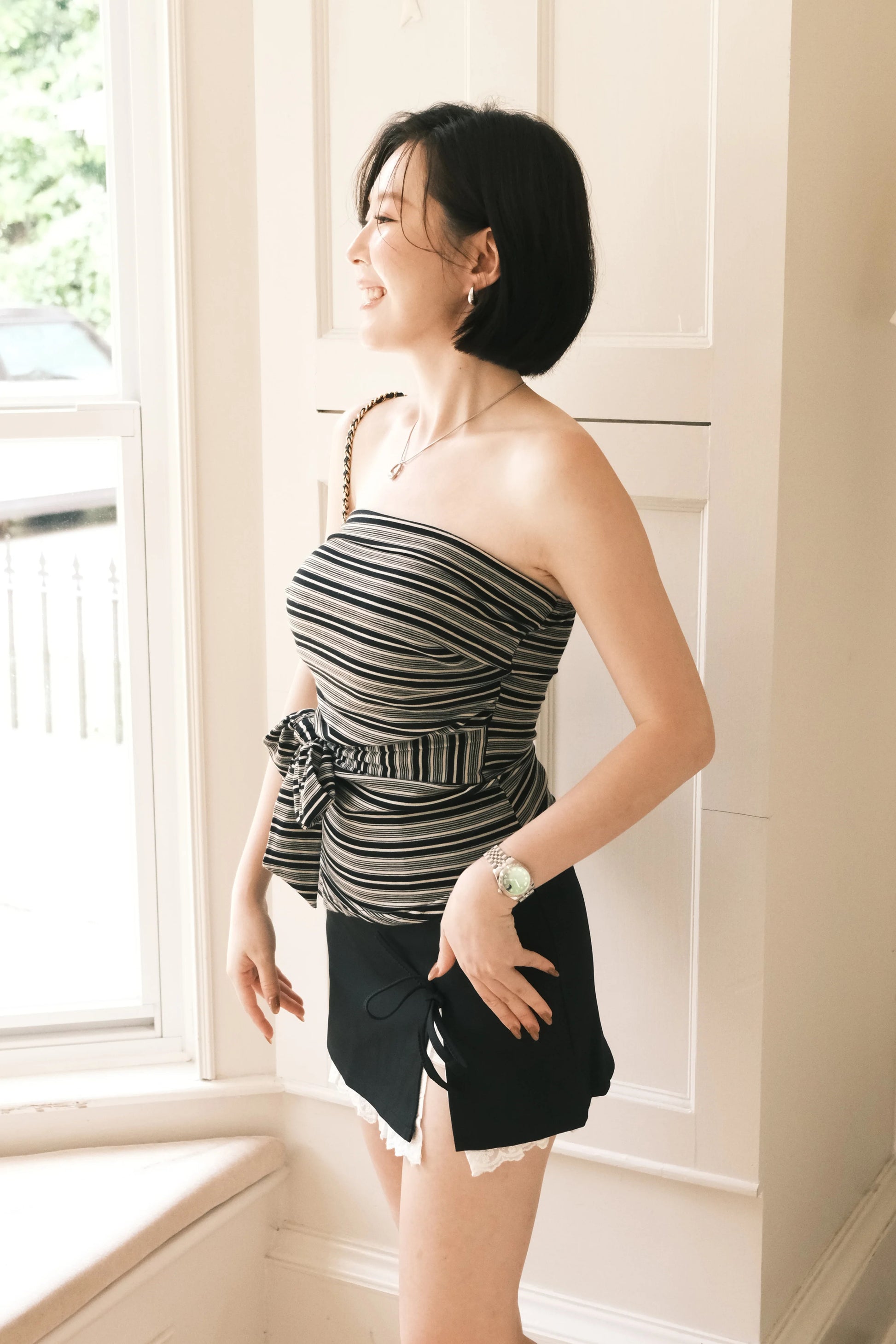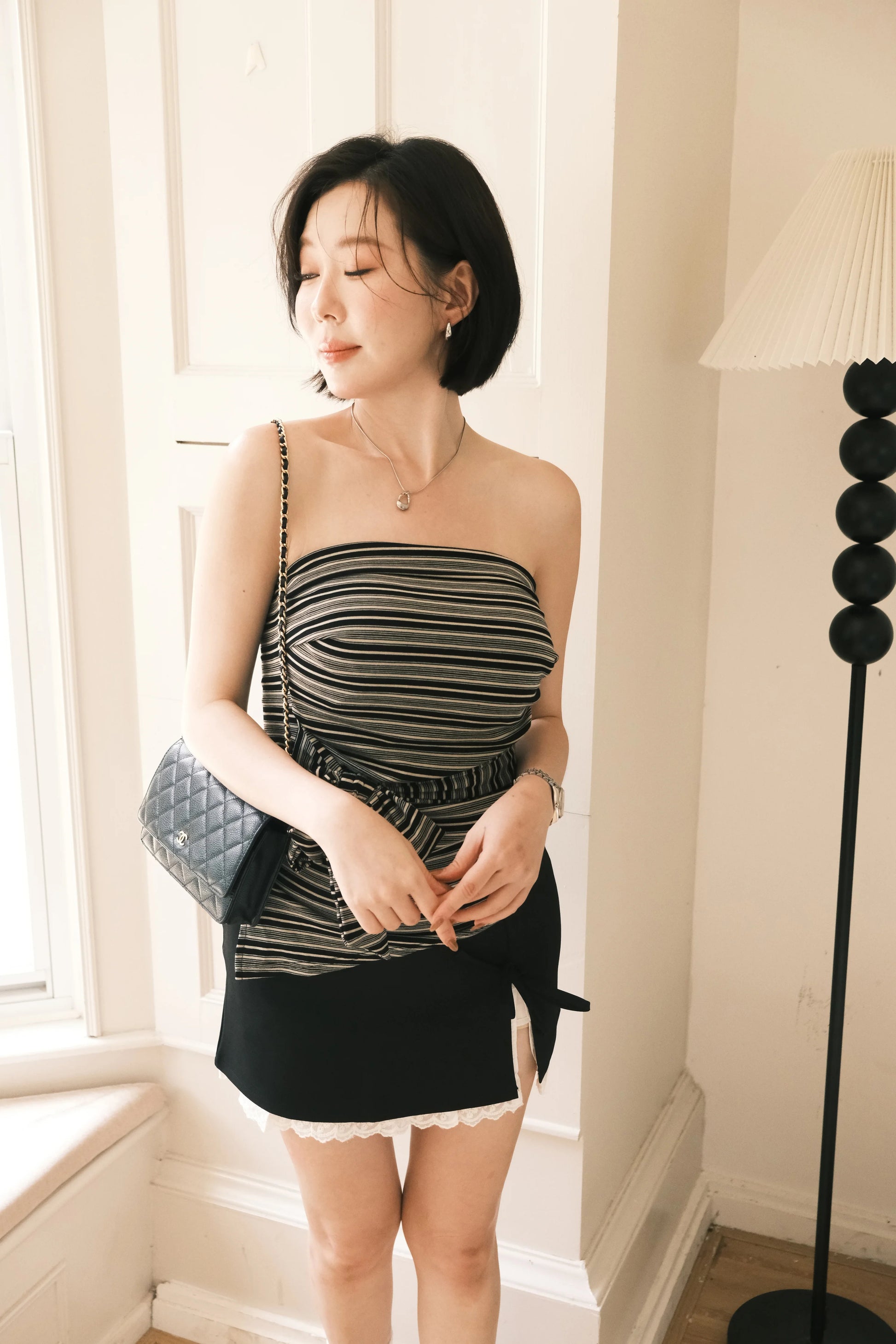 A sweet and feminine mini skirt designed with a signature bow-tie side slit and a delicate lace underlayer. The clean, tailored silhouette keeps it flattering, while the scalloped lace hem adds a charming Korean-inspired touch.