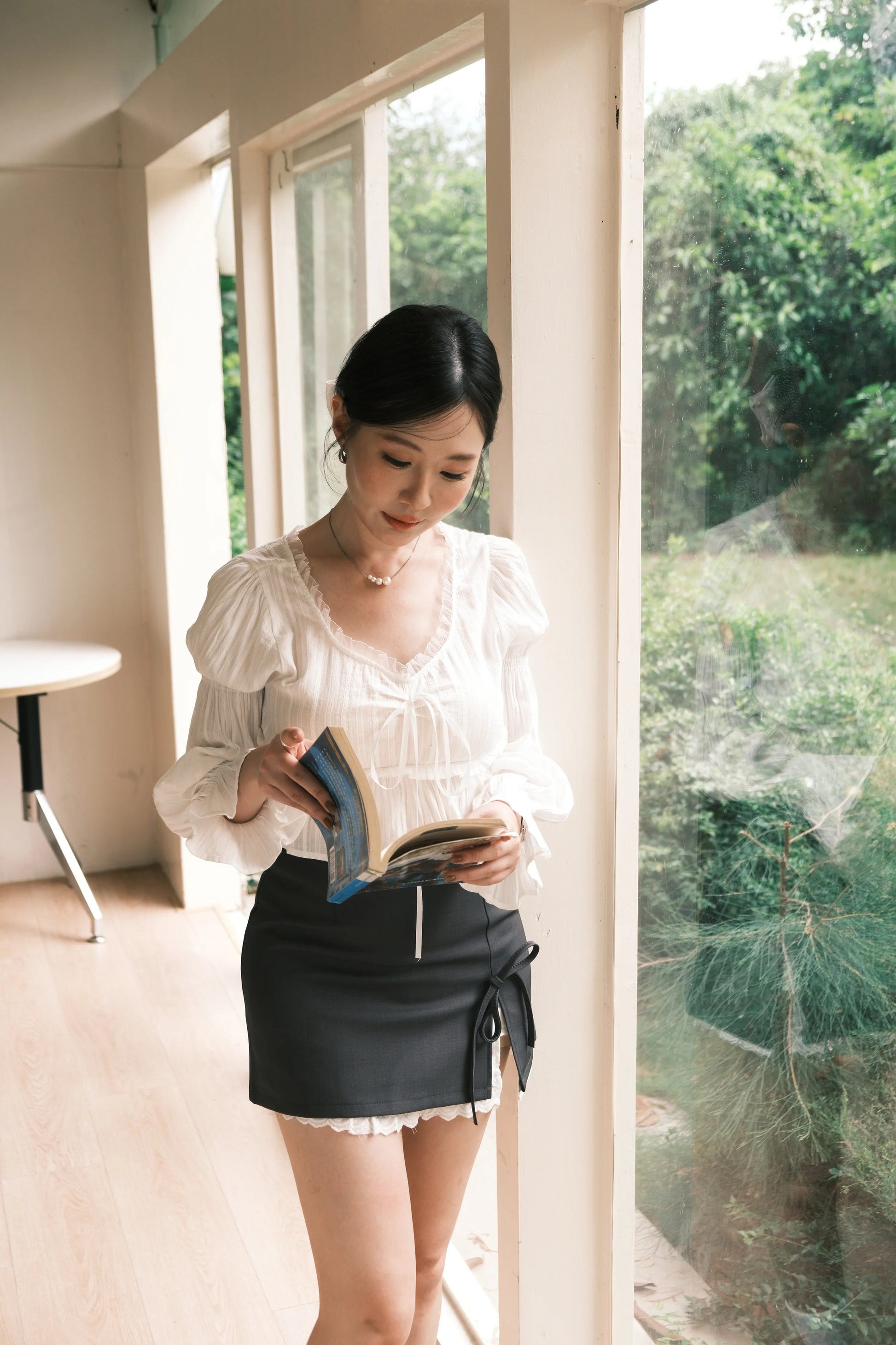A sweet and feminine mini skirt designed with a signature bow-tie side slit and a delicate lace underlayer. The clean, tailored silhouette keeps it flattering, while the scalloped lace hem adds a charming Korean-inspired touch.