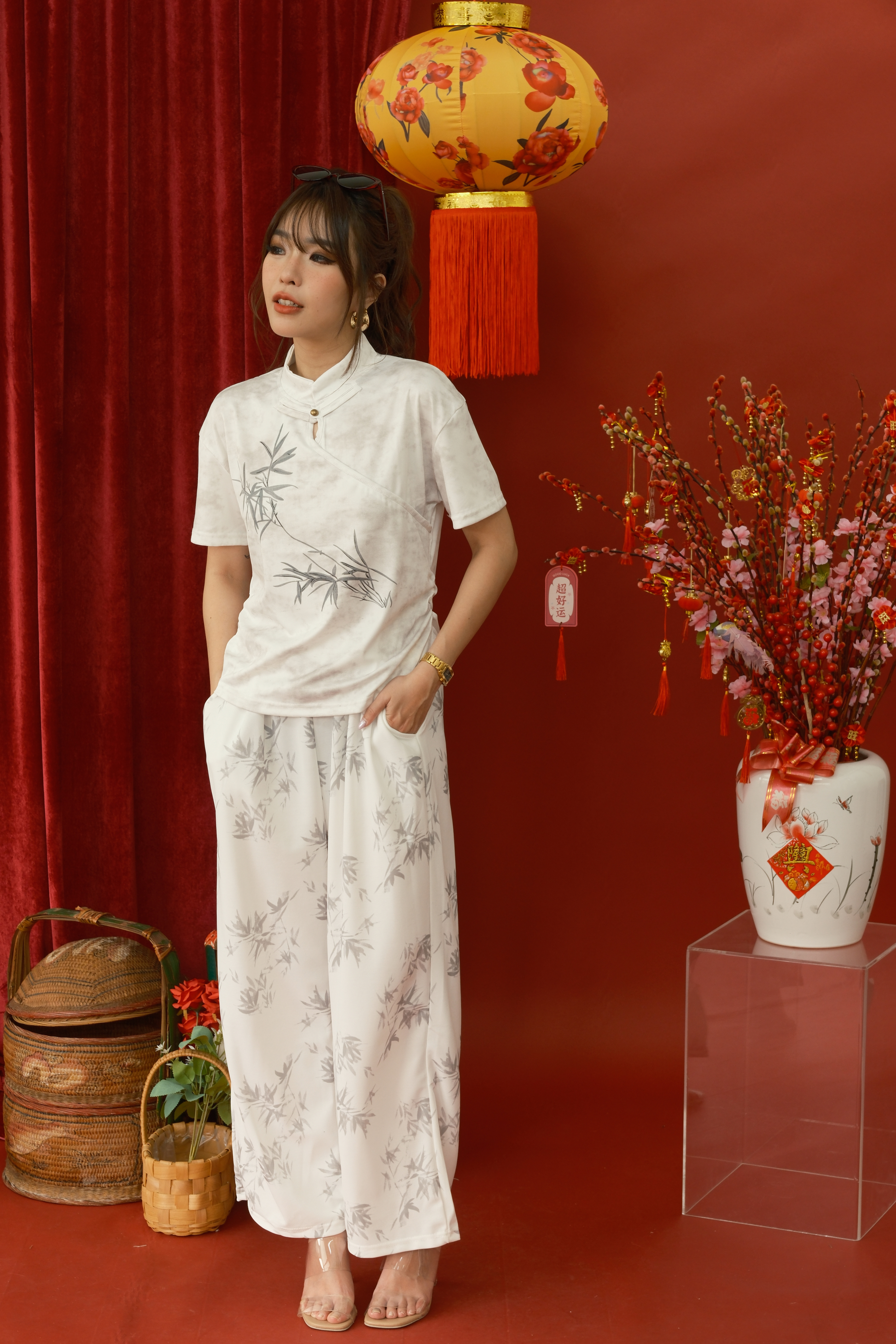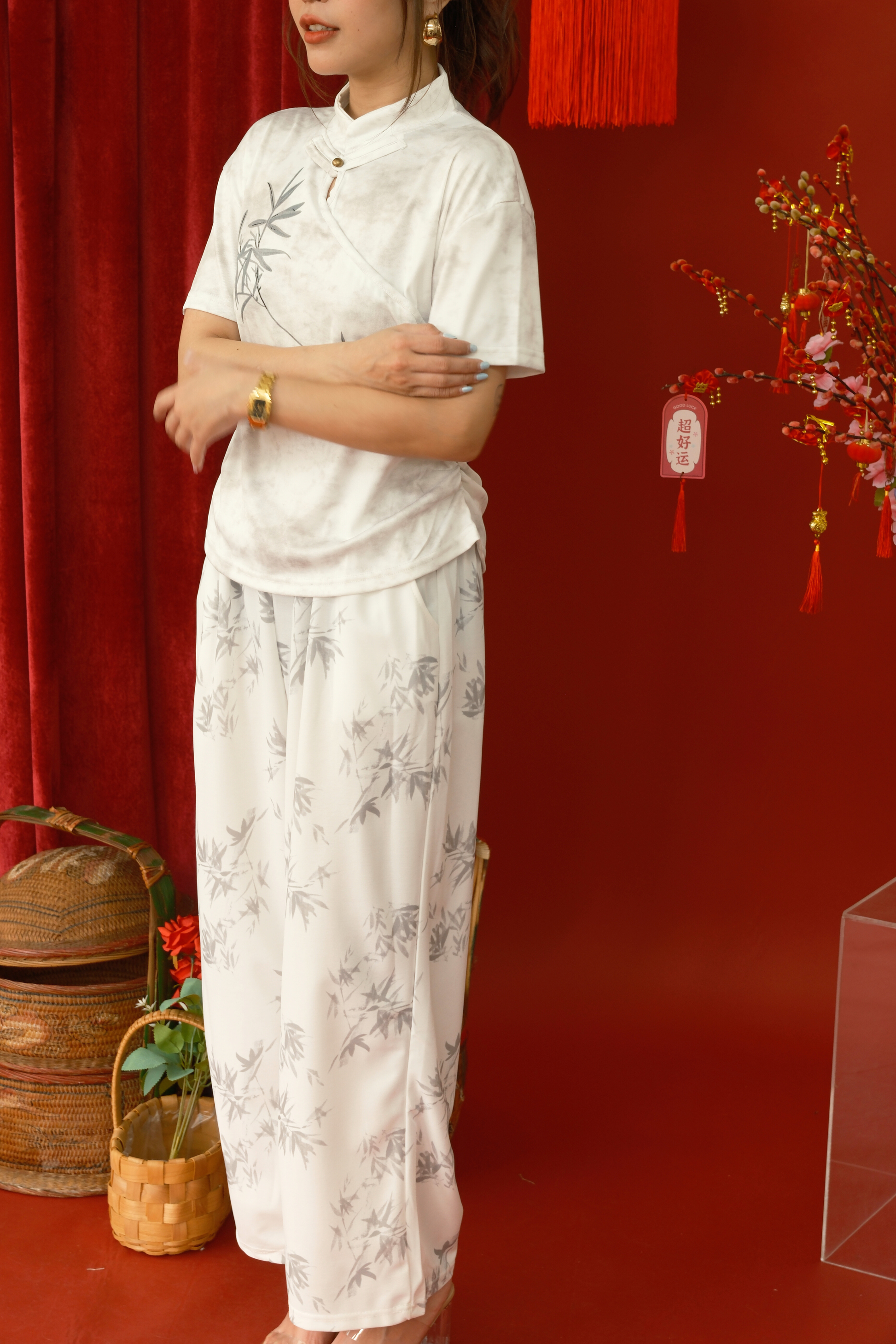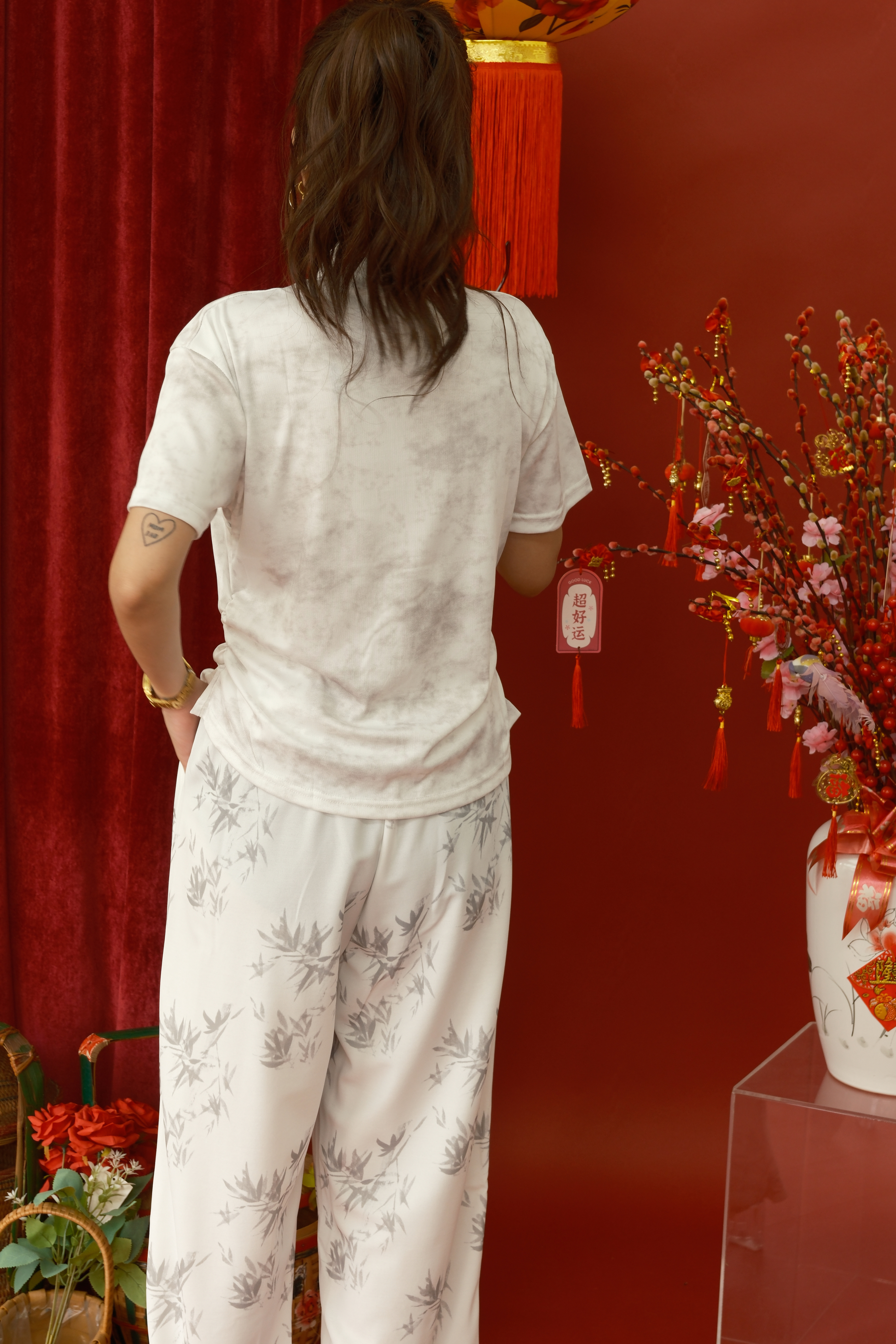 Effortlessly serene, the Camélia Bamboo Lounge Set blends soft tie-dye texture with delicate ink-style bamboo prints. Featuring a Mandarin collar top with traditional frog buttons and flowy wide-leg pants, this look reimagines classic Chinese aesthetics in a relaxed, breathable silhouette—perfect for festive mornings or elegant lounging at home.