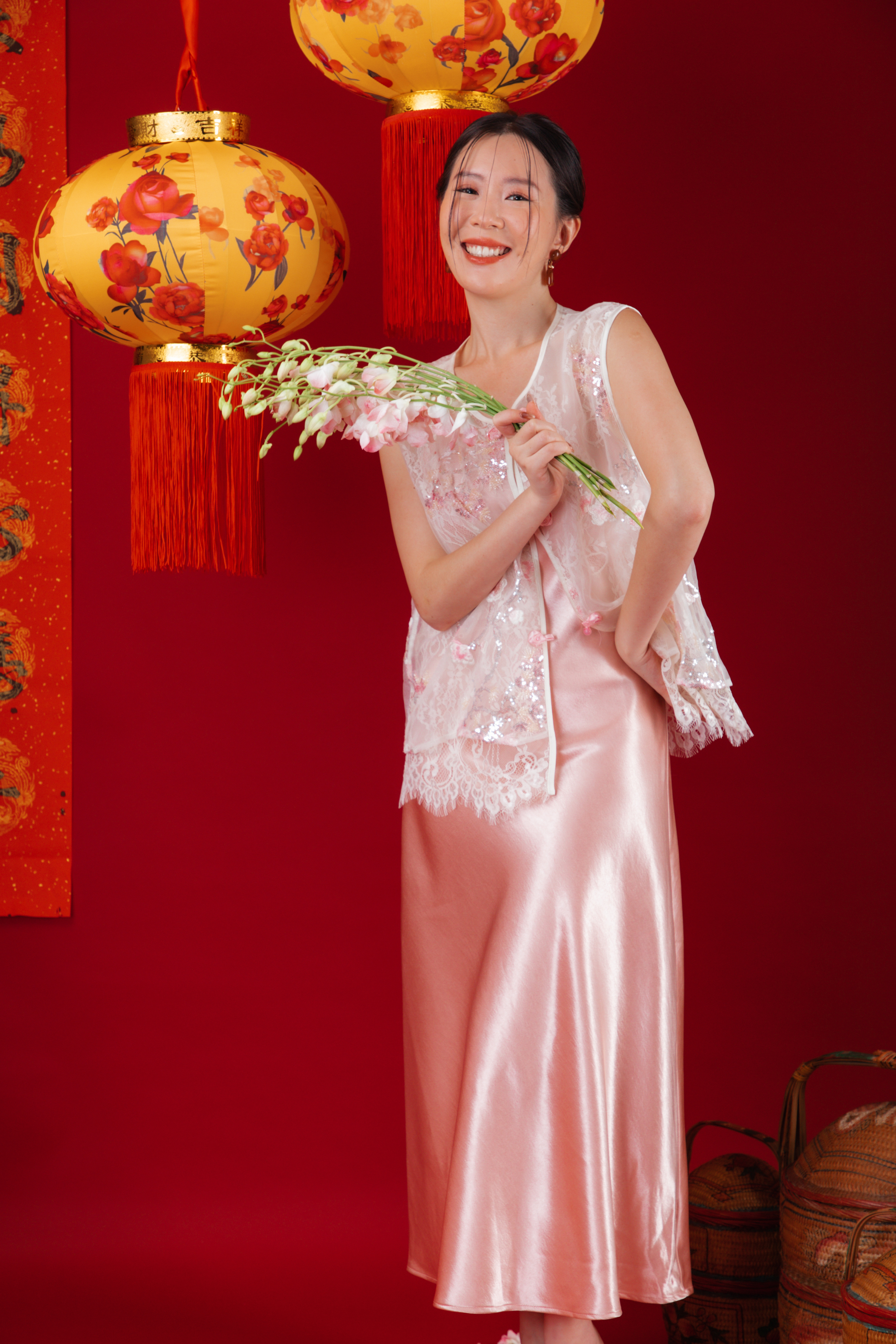 Elowen Embroidered Lace Vest / Rosé Satin Slip Dress