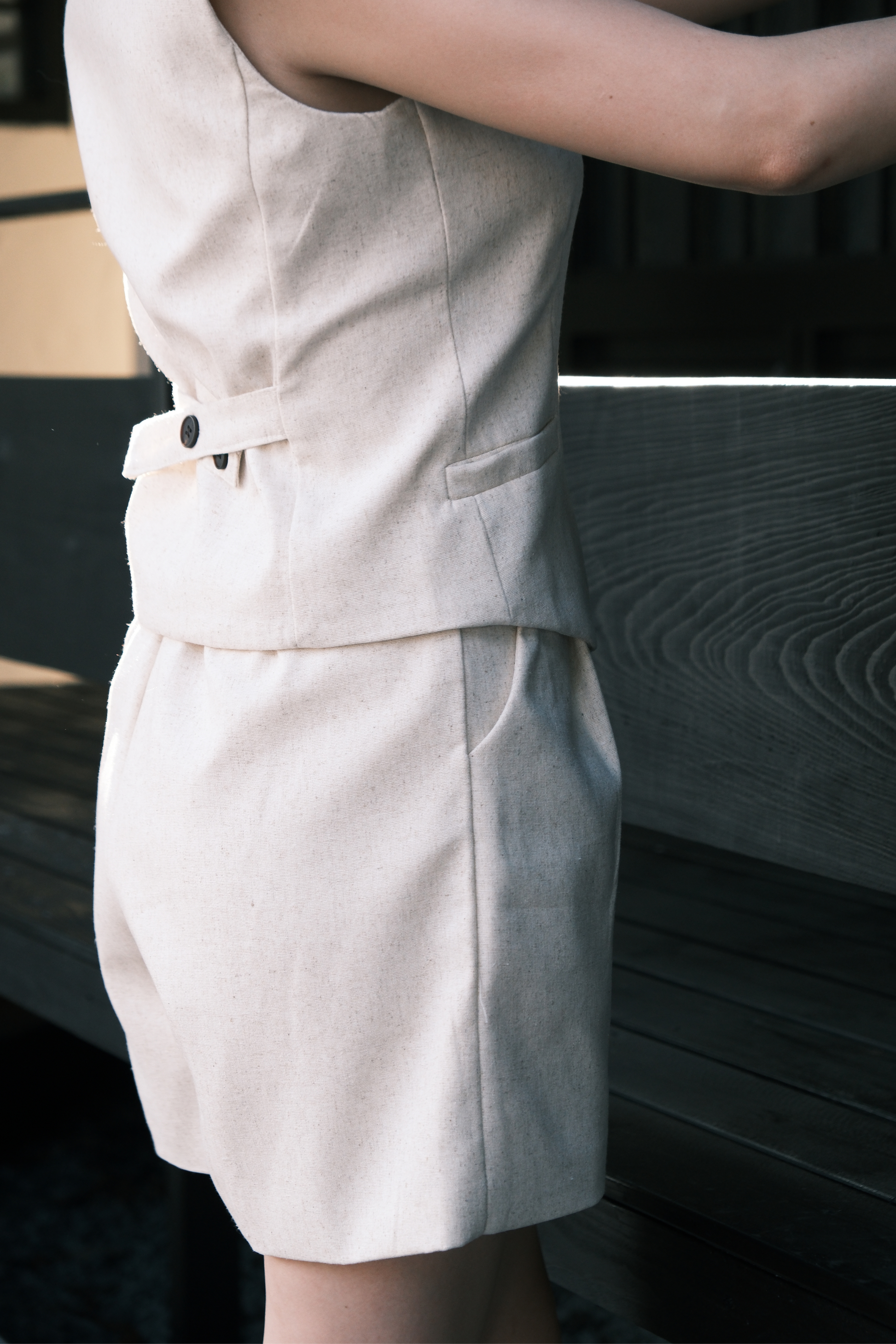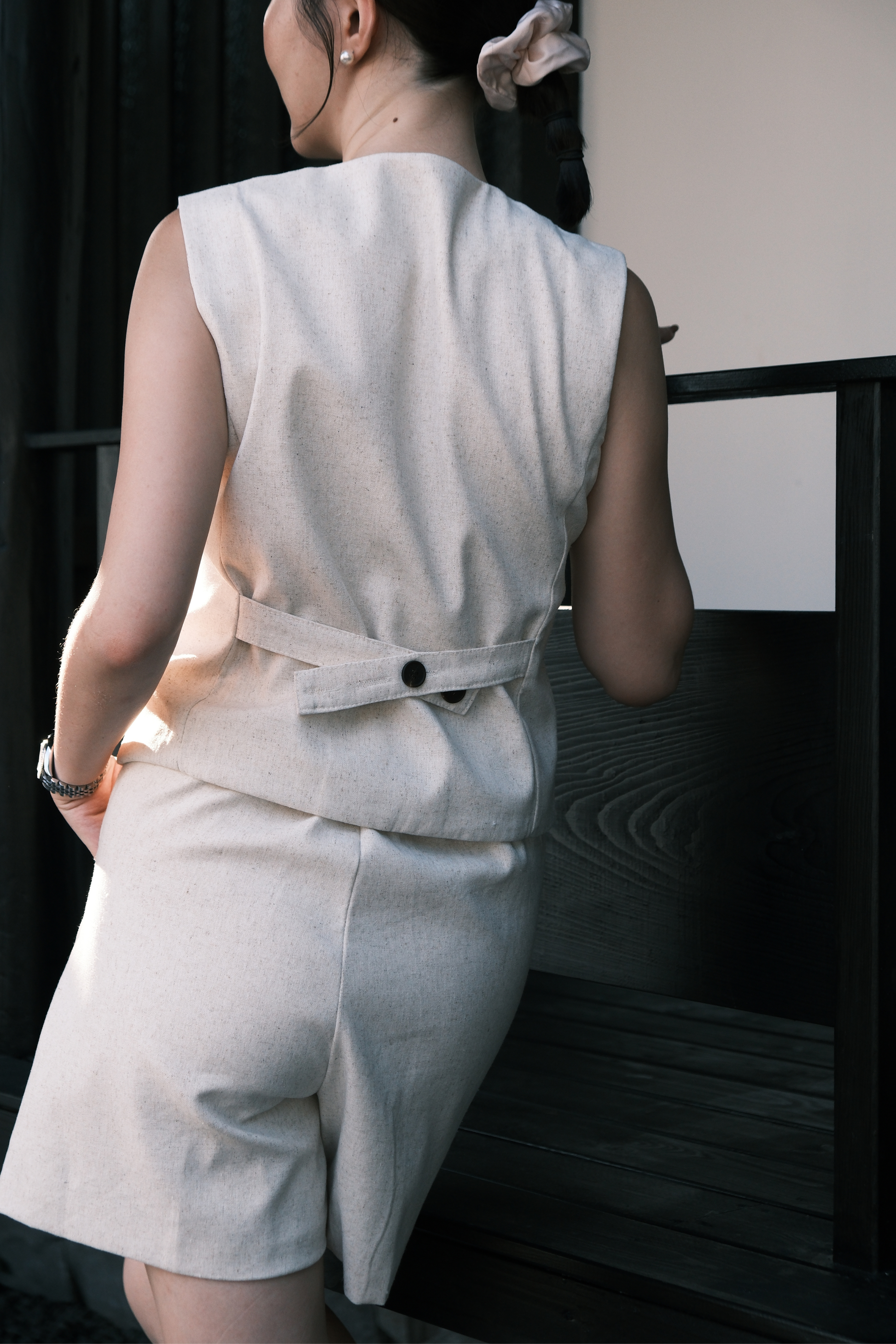 Effortlessly polished and refreshingly lightweight β the Harper Linen Tailored Vest & Shorts Set is designed for warm-weather sophistication. The minimalist vest features a sharp V-neckline, structured shoulders, and classic contrast buttons for a clean, tailored finish. Paired with relaxed high-waist shorts crafted in breathable linen-blend fabric, this set offers the perfect balance between sharp tailoring and everyday comfort.