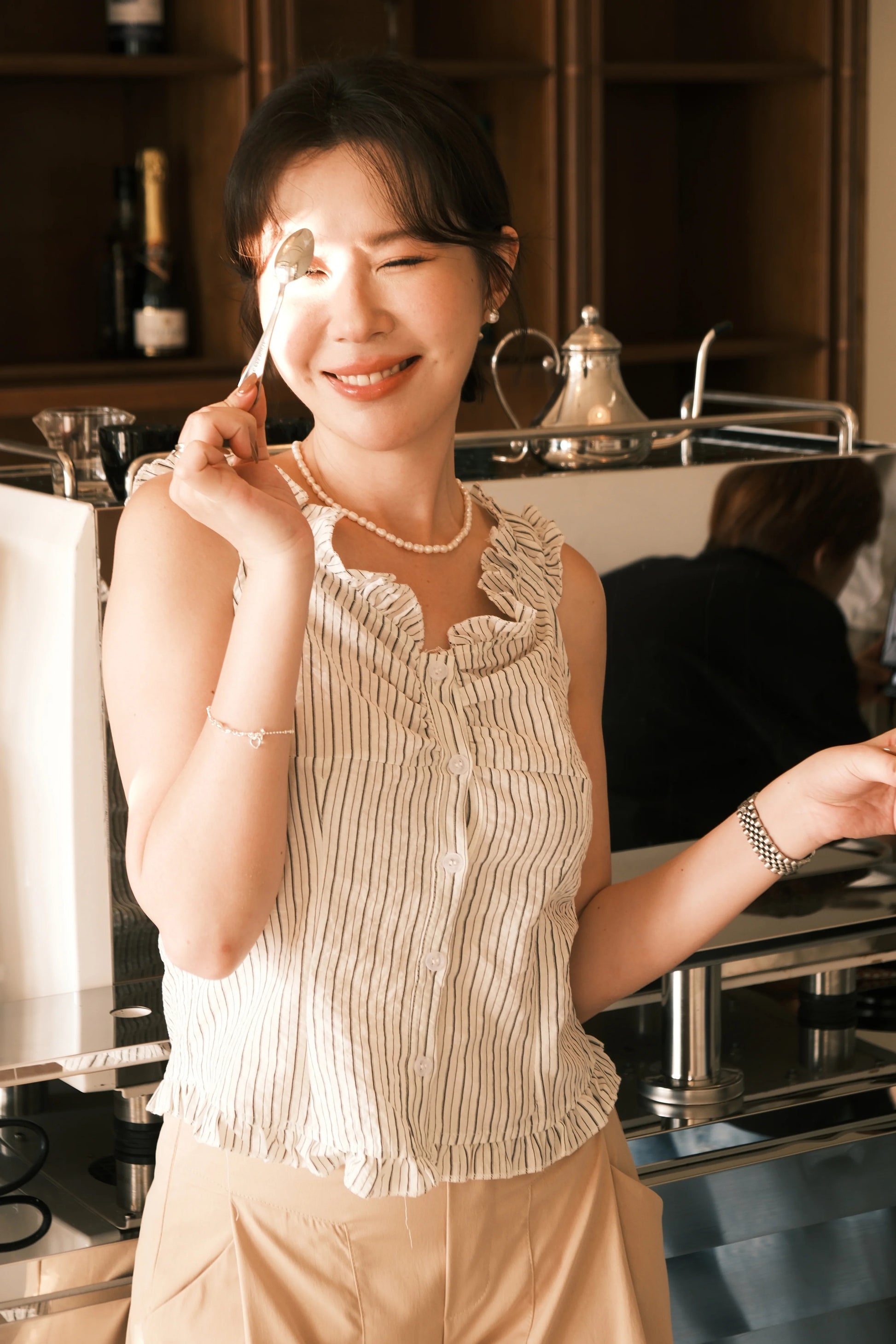 Sweet and effortlessly chic — the Léa Striped Ruffled Sleeveless Top features delicate vertical stripes, a soft ruffled neckline, and a flattering V-cut design. Light and breathable, it’s perfect for sunny days, casual brunches, or café strolls.