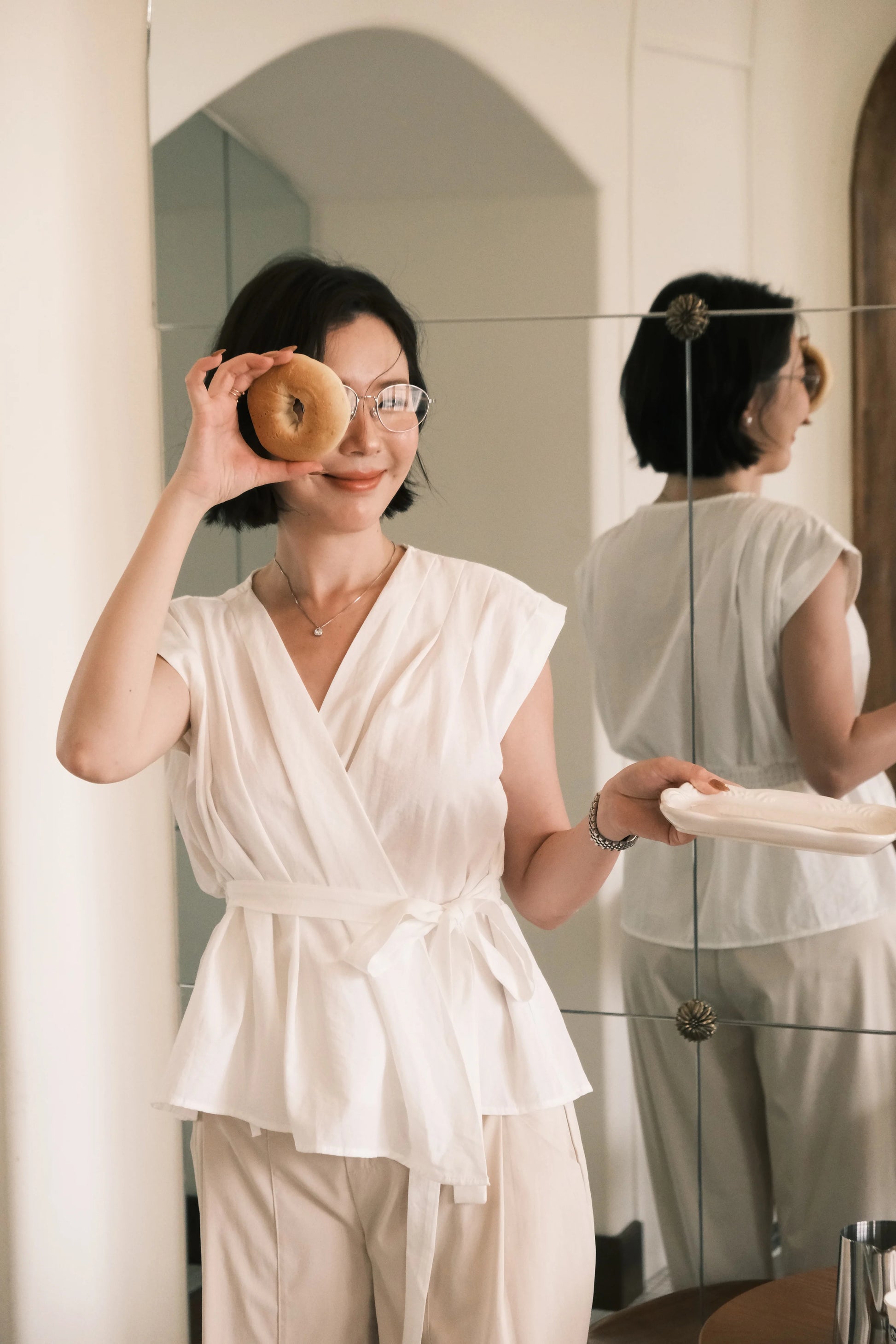 A polished essential designed for understated elegance. This wrap-style blouse features a clean V-neckline, structured cap sleeves, and a soft peplum hem that highlights the waist effortlessly. The adjustable self-tie belt offers a customizable fit, creating a flattering shape without compromising comfort.