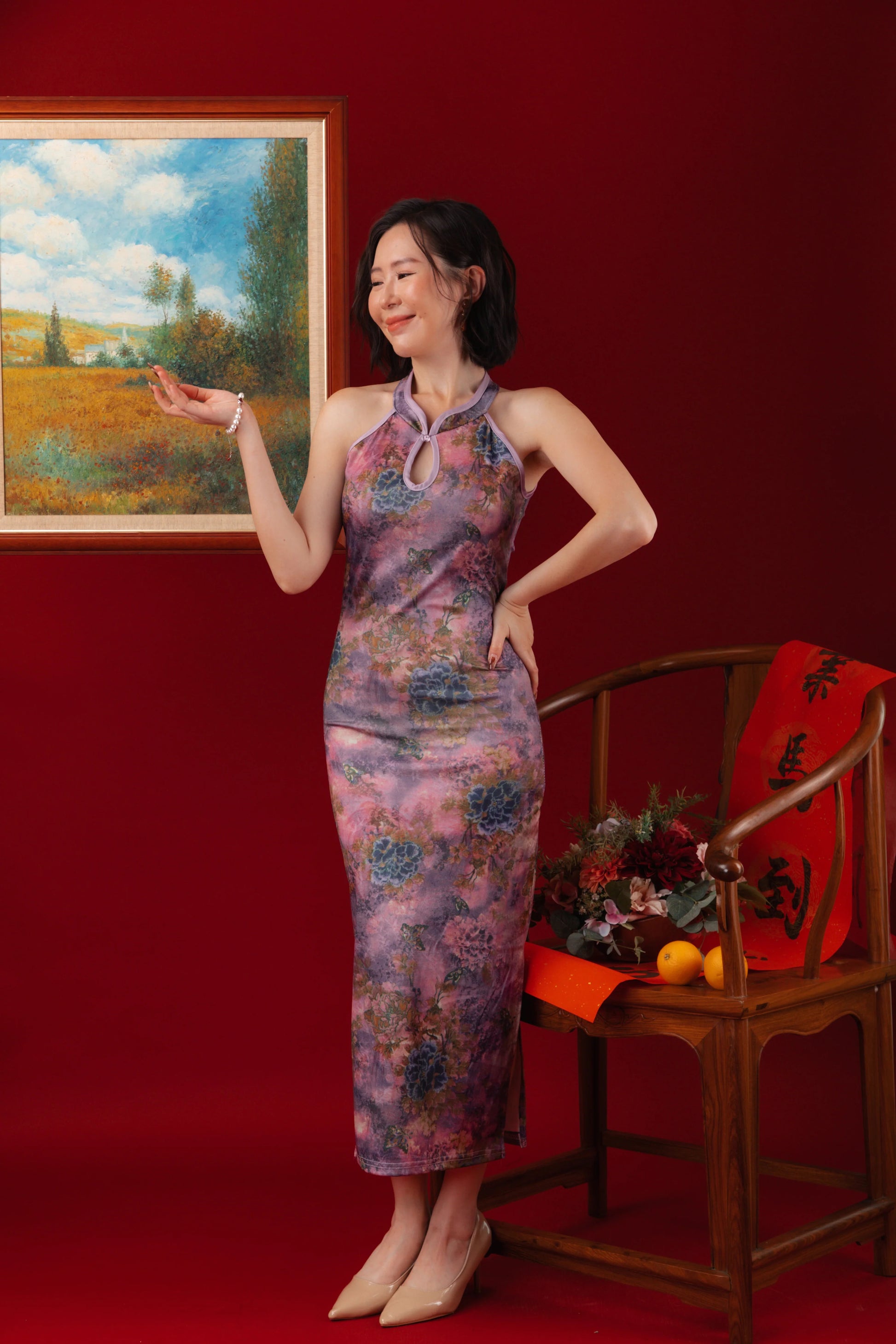 The Violet Blossom Halter Cheongsam Dress captures modern sophistication with an oriental touch. Crafted in a dreamy mix of lilac and rose tones, it features a graceful halter neckline with teardrop cut-out detailing and a figure-hugging silhouette that flows into a sleek long skirt. The floral print evokes quiet elegance — perfect for festive dinners or refined evening occasions.